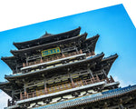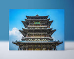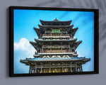 Photograph of the Wanghailou (望海楼), the “Sea-Viewing Tower”, a traditional Chinese pagoda with tiered rooftops and intricate wooden architecture. This iconic structure reflects classic East Asian design, with curved eaves, tiled roofs, and calligraphy signboards in gold. Pagodas like Wanghailou were historically built as Buddhist towers, often symbolizing harmony between heaven and earth while serving as lookout points over the surrounding landscape.