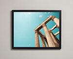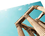 A dramatic low-angle view of ancient ruins, showcasing weathered stone columns and intricate capitals that rise proudly into the clear blue open sky. The image highlights both the strength and fragility of classical architecture, capturing the enduring legacy of civilizations long past.