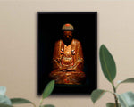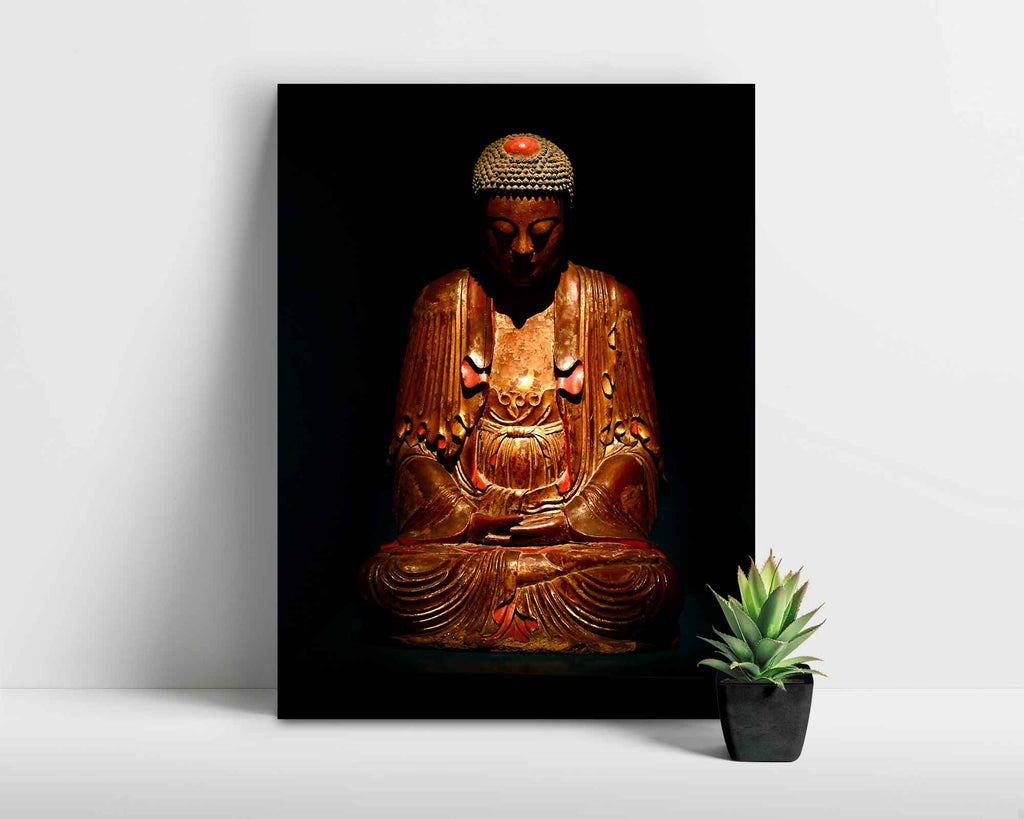 This striking Buddha statue depicts serene meditation in the Dhyana Mudra, with intricate flowing robes accented by subtle red details. A distinct red ornament crowns the textured curls, while warm earthy tones and soft lighting highlight its timeless spiritual presence. Perfect as a centrepiece for reflection and tranquillity.