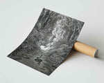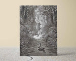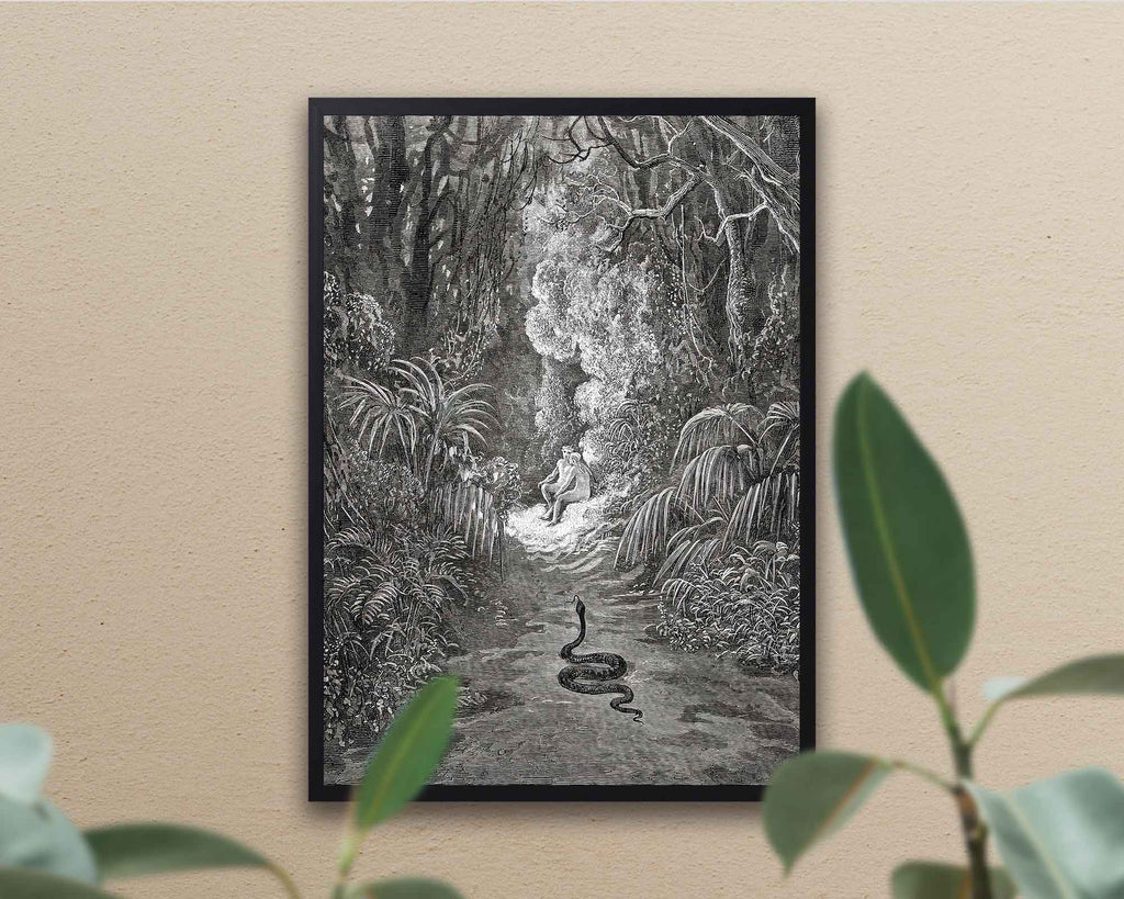 Paradise Lost: The Serpent Approaches by Gustave Doré is a detailed engraving depicting the moment Satan, in the form of a serpent, prepares to tempt Eve. The scene is dark and atmospheric, with the serpent quietly watching from the shadows. Doré’s use of contrast highlights Eve’s innocence against the subtle threat, capturing the quiet tension before the Fall with understated drama.